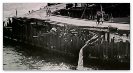 بعد از مسطح کردن زمین کف و آماده شدن شرایط کار ، بلوک های عظیم بتنی ساخته شده و به کف آب فرستاده شده و در کف به هم قفل شدند.